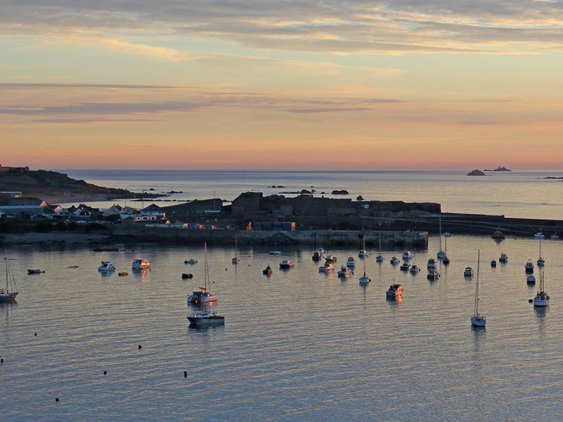 Braye Harbour at sunset - a picturesque anchorage with over 70 visitor moorings